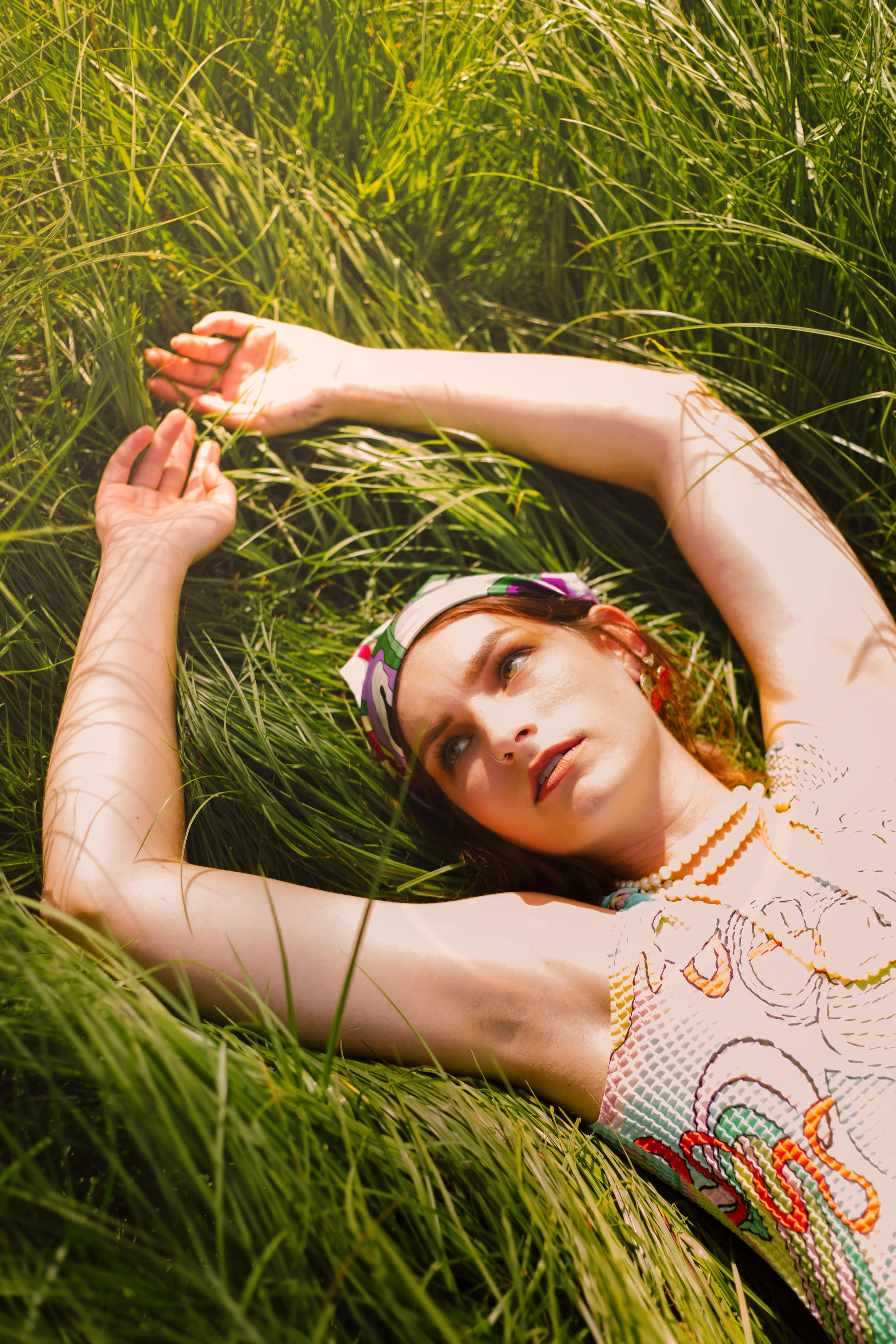 A woman with red hair lying on her back in a field of tall green grass, wearing a colorful headscarf, earrings, a beaded necklace, and a patterned white top, looking thoughtfully into the distance.